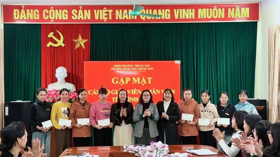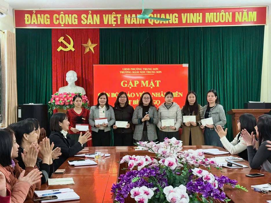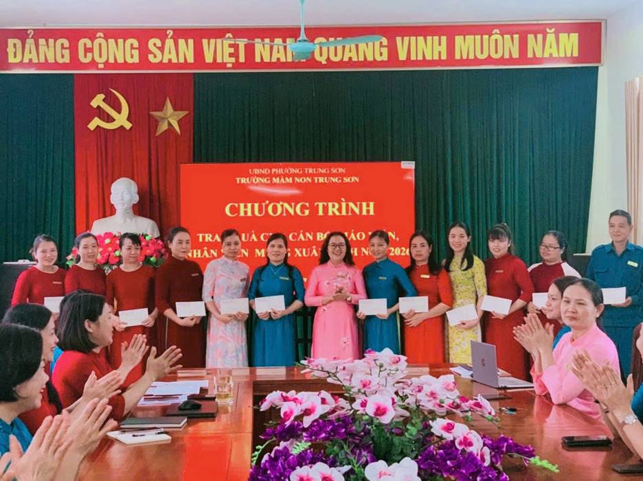Với sự quan tâm của chính quyền địa phương, UBND phường Trung Sơn đã trao tặng 6 suất quà và 1 giỏ quà, tổng trị giá 2.500.000 đồng cho các cháu và giáo viên, nhân viên có hoàn cảnh khó khăn. Đây là nguồn động viên ý nghĩa, thể hiện sự đồng hành và chăm lo của lãnh đạo địa phương đối với sự nghiệp giáo dục và đời sống đội ngũ.